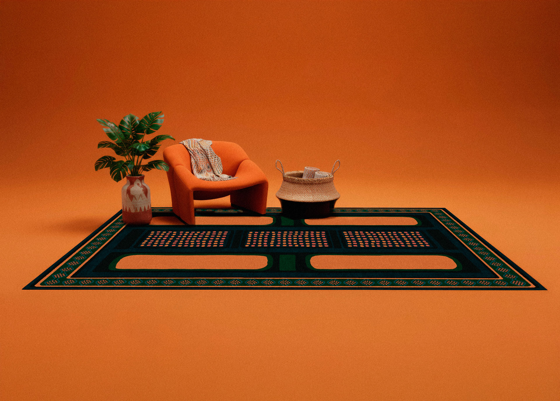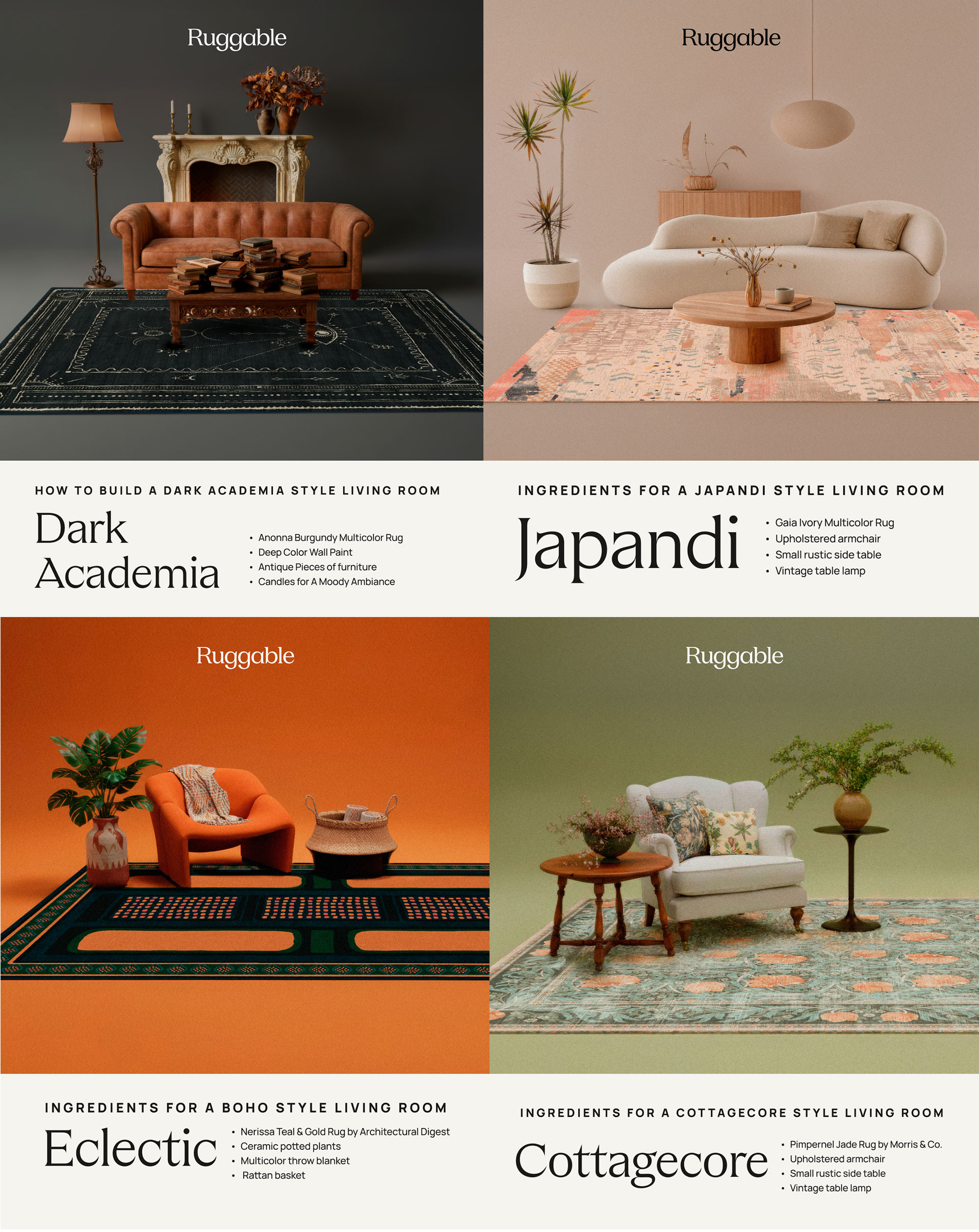 This project is part of a series of AI-generated visual scenes developed for Ruggable while working at Within LLC. The objective was to create a collection of stylized interior environments that showcase different rug designs through atmospheric lifestyle imagery. Each scene was generated using artificial intelligence and art-directed to build cohesive visual narratives inspired by various interior design aesthetics. The compositions combine furniture, lighting, materials, and color palettes to highlight the rugs within aspirational living spaces designed for digital campaigns and social media content.
